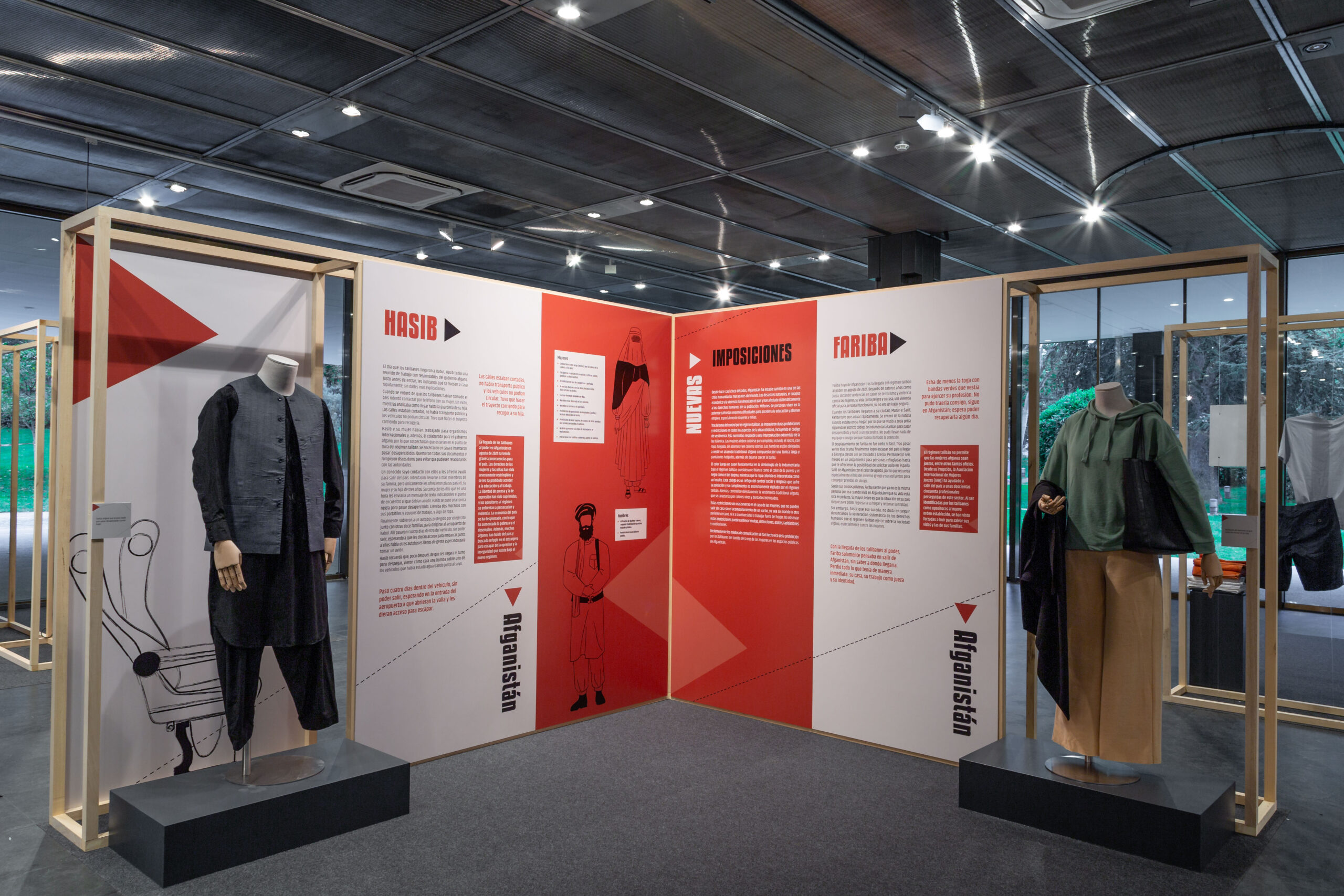 9 módulos expositivos con escenografías textiles, objetos personales, paneles gráficos y elementos audiovisuales. Incluye maniquíes, prendas de ropa, complementos y mobiliario.